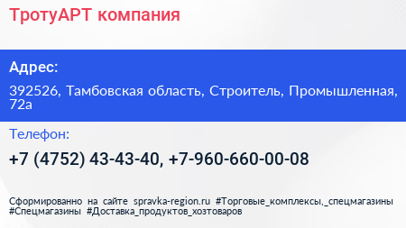 ТротуАРТ, компания по адресу 392526, Тамбовская область, Строитель, Промышленная, 72а в дальнейшем Организация, размещена в следующих категориях: