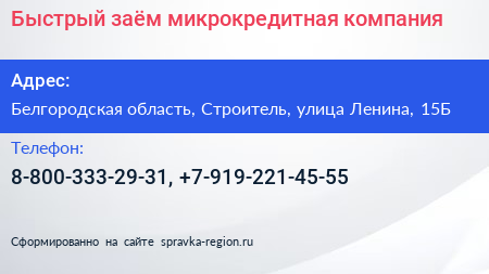 Быстрый заём, микрокредитная компания по адресу Белгородская область, Строитель, улица Ленина, 15Б в дальнейшем Организация, размещена в следующих категориях: