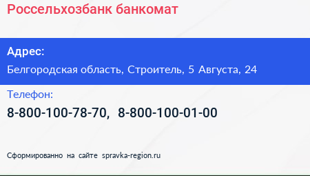Россельхозбанк, банкомат по адресу Белгородская область, Строитель, 5 Августа, 24 в дальнейшем Организация, размещена в следующих категориях: