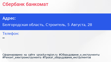 Сбербанк, банкомат по адресу Белгородская область, Строитель, 5 Августа, 28 в дальнейшем Организация, размещена в следующих категориях: