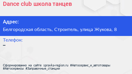 Dance-club, школа танцев по адресу Белгородская область, Строитель, улица Жукова, 8 в дальнейшем Организация, размещена в следующих категориях: