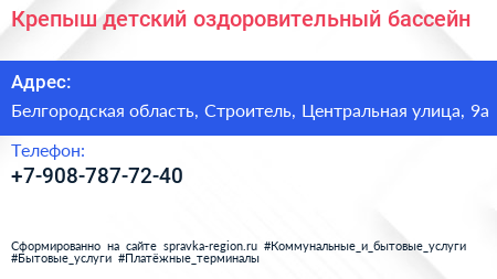 Крепыш, детский оздоровительный бассейн по адресу Белгородская область, Строитель, Центральная улица, 9а в дальнейшем Организация, размещена в следующих категориях: