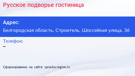 Русское подворье, гостиница по адресу Белгородская область, Строитель, Шоссейная улица, 36 в дальнейшем Организация, размещена в следующих категориях: