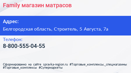 Family, магазин матрасов по адресу Белгородская область, Строитель, 5 Августа, 7а в дальнейшем Организация, размещена в следующих категориях: