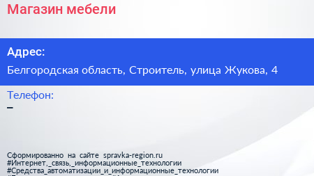 Магазин мебели по адресу Белгородская область, Строитель, улица Жукова, 4 в дальнейшем Организация, размещена в следующих категориях: