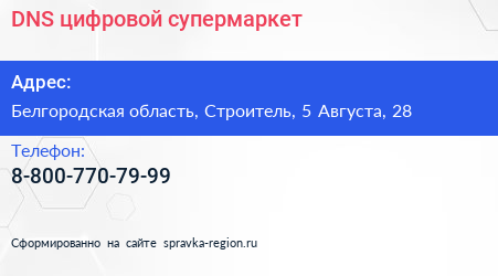 DNS, цифровой супермаркет по адресу Белгородская область, Строитель, 5 Августа, 28 в дальнейшем Организация, размещена в следующих категориях: