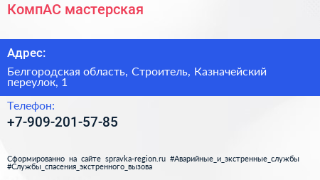 КомпАС, мастерская по адресу Белгородская область, Строитель, Казначейский переулок, 1 в дальнейшем Организация, размещена в следующих категориях: