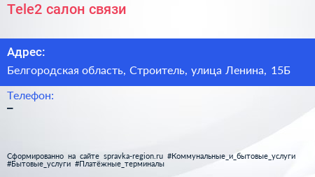 Tele2, салон связи по адресу Белгородская область, Строитель, улица Ленина, 15Б в дальнейшем Организация, размещена в следующих категориях: