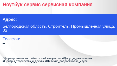 Ноутбук-cервис, сервисная компания по адресу Белгородская область, Строитель, Промышленная улица, 32 в дальнейшем Организация, размещена в следующих категориях: