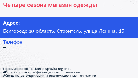 Четыре сезона, магазин одежды по адресу Белгородская область, Строитель, улица Ленина, 15 в дальнейшем Организация, размещена в следующих категориях: