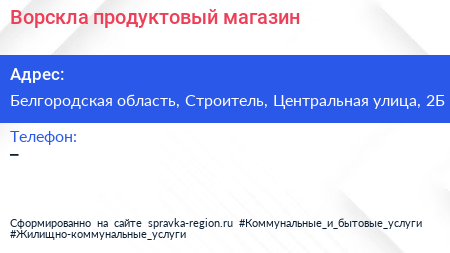 Ворскла, продуктовый магазин по адресу Белгородская область, Строитель, Центральная улица, 2Б в дальнейшем Организация, размещена в следующих категориях: