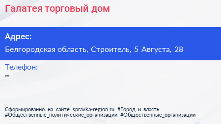 Галатея, торговый дом по адресу Белгородская область, Строитель, 5 Августа, 28 в дальнейшем Организация, размещена в следующих категориях: