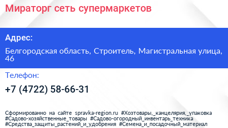 Мираторг, сеть супермаркетов по адресу Белгородская область, Строитель, Магистральная улица, 46 в дальнейшем Организация, размещена в следующих категориях: