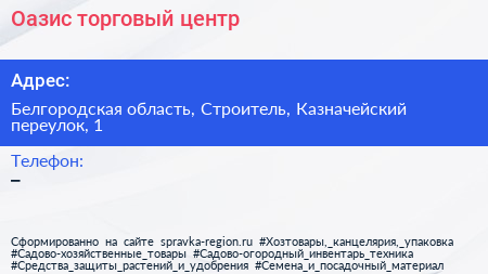 Оазис, торговый центр по адресу Белгородская область, Строитель, Казначейский переулок, 1 в дальнейшем Организация, размещена в следующих категориях: