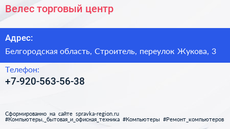 Велес, торговый центр по адресу Белгородская область, Строитель, переулок Жукова, 3 в дальнейшем Организация, размещена в следующих категориях: