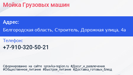 Мойка Грузовых машин по адресу Белгородская область, Строитель, Дорожная улица, 4а в дальнейшем Организация, размещена в следующих категориях: