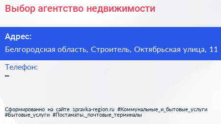Выбор, агентство недвижимости по адресу Белгородская область, Строитель, Октябрьская улица, 11 в дальнейшем Организация, размещена в следующих категориях:
