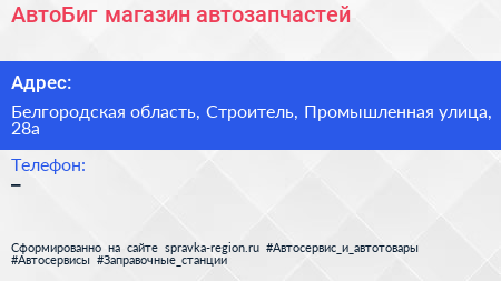 АвтоБиг, магазин автозапчастей по адресу Белгородская область, Строитель, Промышленная улица, 28а в дальнейшем Организация, размещена в следующих категориях: