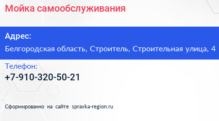 Мойка самообслуживания по адресу Белгородская область, Строитель, Строительная улица, 4 в дальнейшем Организация, размещена в следующих категориях: