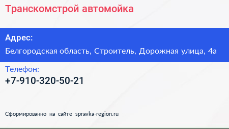 Транскомстрой, автомойка по адресу Белгородская область, Строитель, Дорожная улица, 4а в дальнейшем Организация, размещена в следующих категориях: