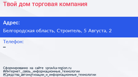 Твой дом, торговая компания по адресу Белгородская область, Строитель, 5 Августа, 2 в дальнейшем Организация, размещена в следующих категориях: