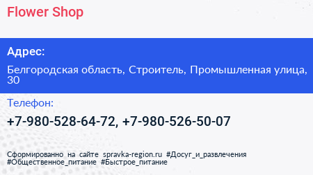 Flower Shop по адресу Белгородская область, Строитель, Промышленная улица, 30 в дальнейшем Организация, размещена в следующих категориях: