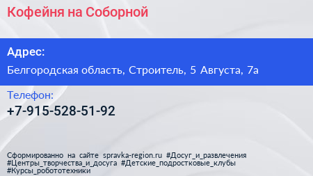 Кофейня на Соборной по адресу Белгородская область, Строитель, 5 Августа, 7а в дальнейшем Организация, размещена в следующих категориях: