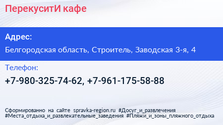 ПерекуситИ, кафе по адресу Белгородская область, Строитель, Заводская 3-я, 4 в дальнейшем Организация, размещена в следующих категориях: