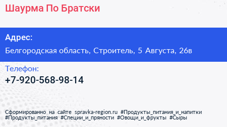 Шаурма По-Братски по адресу Белгородская область, Строитель, 5 Августа, 26в в дальнейшем Организация, размещена в следующих категориях: