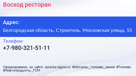 Восход, ресторан по адресу Белгородская область, Строитель, Московская улица, 55 в дальнейшем Организация, размещена в следующих категориях: