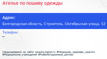 Ателье по пошиву одежды по адресу Белгородская область, Строитель, Октябрьская улица, 12 в дальнейшем Организация, размещена в следующих категориях: