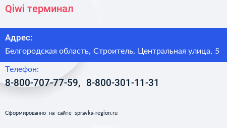 Qiwi, терминал по адресу Белгородская область, Строитель, Центральная улица, 5 в дальнейшем Организация, размещена в следующих категориях: