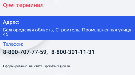 Qiwi, терминал по адресу Белгородская область, Строитель, Промышленная улица, 45 в дальнейшем Организация, размещена в следующих категориях: