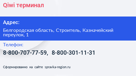 Qiwi, терминал по адресу Белгородская область, Строитель, Казначейский переулок, 1 в дальнейшем Организация, размещена в следующих категориях: