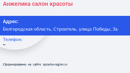Анжелика, салон красоты по адресу Белгородская область, Строитель, улица Победы, 3а в дальнейшем Организация, размещена в следующих категориях: