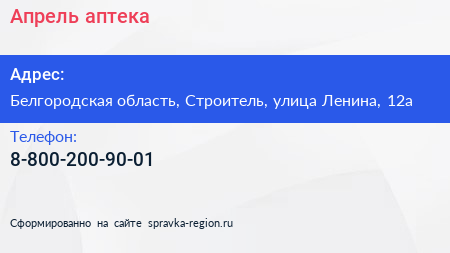 Апрель, аптека по адресу Белгородская область, Строитель, улица Ленина, 12а в дальнейшем Организация, размещена в следующих категориях: