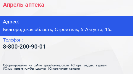 Апрель, аптека по адресу Белгородская область, Строитель, 5 Августа, 15а в дальнейшем Организация, размещена в следующих категориях: