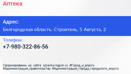 Аптека по адресу Белгородская область, Строитель, 5 Августа, 2 в дальнейшем Организация, размещена в следующих категориях: