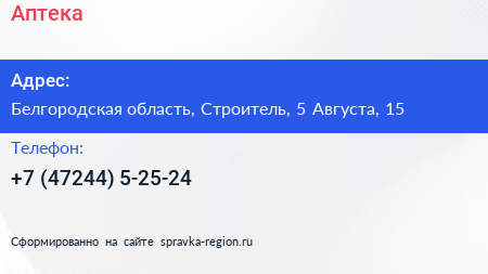 Аптека по адресу Белгородская область, Строитель, 5 Августа, 15 в дальнейшем Организация, размещена в следующих категориях: