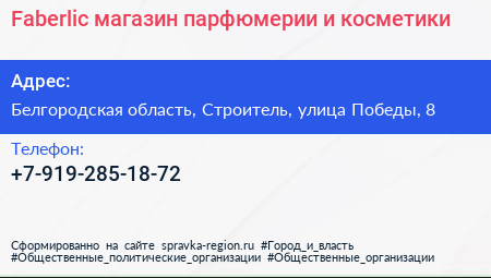 Faberlic, магазин парфюмерии и косметики по адресу Белгородская область, Строитель, улица Победы, 8 в дальнейшем Организация, размещена в следующих категориях: