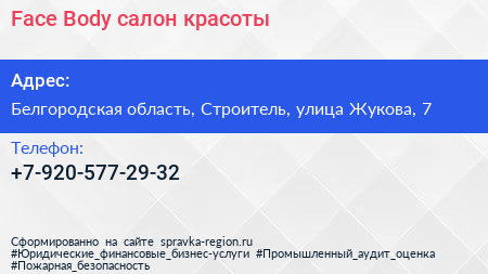 Face & Body, салон красоты по адресу Белгородская область, Строитель, улица Жукова, 7 в дальнейшем Организация, размещена в следующих категориях: