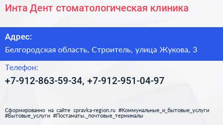 Инта-Дент, стоматологическая клиника по адресу Белгородская область, Строитель, улица Жукова, 3 в дальнейшем Организация, размещена в следующих категориях:
