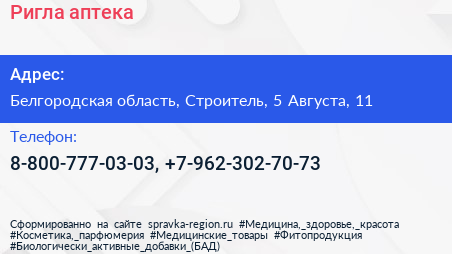 Ригла, аптека по адресу Белгородская область, Строитель, 5 Августа, 11 в дальнейшем Организация, размещена в следующих категориях:
