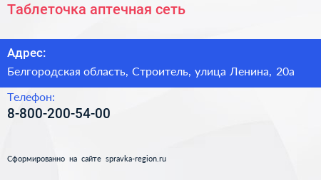 Таблеточка, аптечная сеть по адресу Белгородская область, Строитель, улица Ленина, 20а в дальнейшем Организация, размещена в следующих категориях: