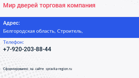 Мир дверей, торговая компания по адресу Белгородская область, Строитель, в дальнейшем Организация, размещена в следующих категориях: