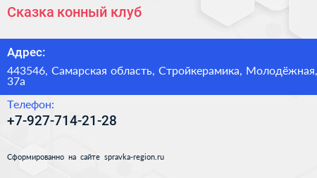 Сказка, конный клуб по адресу 443546, Самарская область, Стройкерамика, Молодёжная, 37а в дальнейшем Организация, размещена в следующих категориях:
