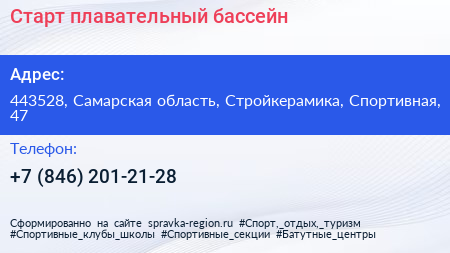 Старт, плавательный бассейн по адресу 443528, Самарская область, Стройкерамика, Спортивная, 47 в дальнейшем Организация, размещена в следующих категориях: