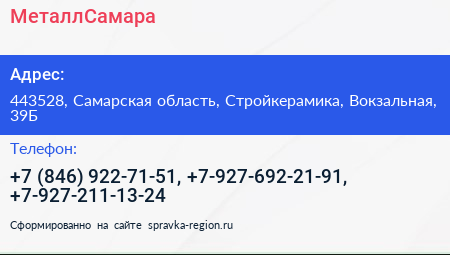 МеталлСамара по адресу 443528, Самарская область, Стройкерамика, Вокзальная, 39Б в дальнейшем Организация, размещена в следующих категориях: