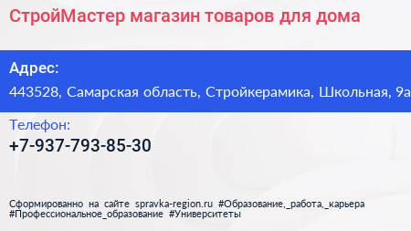 СтройМастер, магазин товаров для дома по адресу 443528, Самарская область, Стройкерамика, Школьная, 9а в дальнейшем Организация, размещена в следующих категориях: