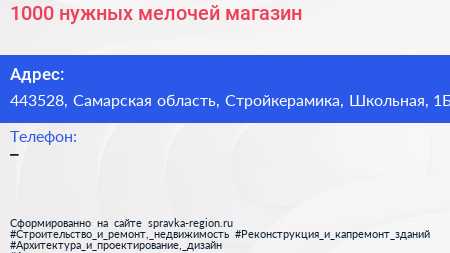 1000 нужных мелочей, магазин по адресу 443528, Самарская область, Стройкерамика, Школьная, 1Б в дальнейшем Организация, размещена в следующих категориях: